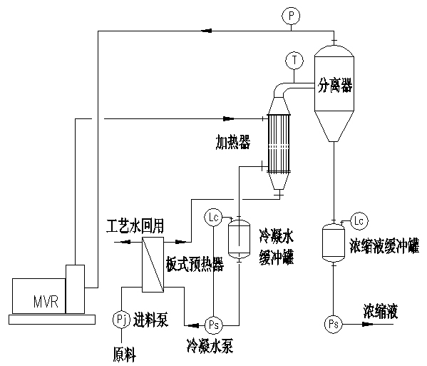 1、對于在蒸發過程中無結晶時,系統比較簡單,系統由預熱器、蒸發器(可以采用升膜式或降膜式)、分離器、MVR壓縮機和接收罐組成(如下圖)再配出料泵及控制部分,組成一套完整的MVR蒸發器系統;蒸發可以是常壓或負壓,根據物料的特性而定,負壓蒸發時要考慮出料泵的汽蝕余量克服系統的真空。